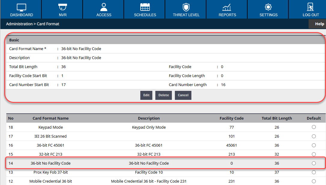 If the Continental 36-bit format is not in there by default, you must scan a Continental badge and modify the format from what the E-Access Decoder shows as a 36-bit format. To open the decoder go to Settings > Card Format and press Decoder on the bottom left to open. Select the reader and press "Card Scan" then swipe the card on the reader selected, to populate the card format.