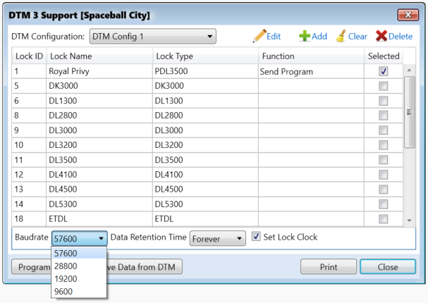 For the selected door lock, add a check the checkbox in the Selected column, then select the Program DTM button to send the current AL-DTM3 configuration data (Baudrate, selected Lock ID and Functions, etc.) to the AL-DTM3. Then use the AL-DTM3 to communicate with the lock as usual (ensure the AL-DTM3 is in PC COMM mode, then select Program DTM).