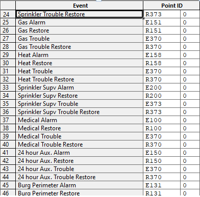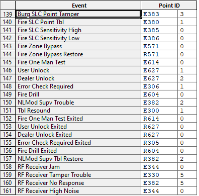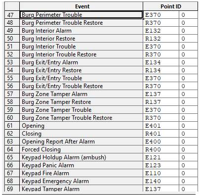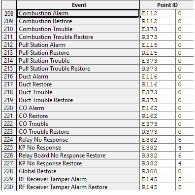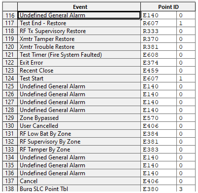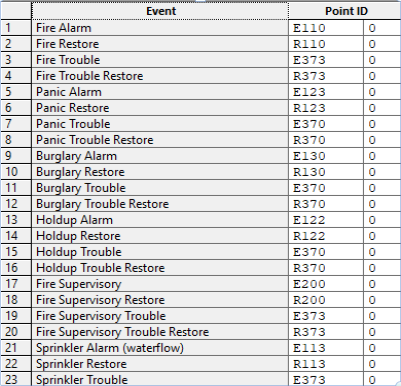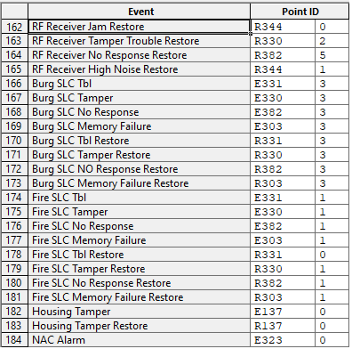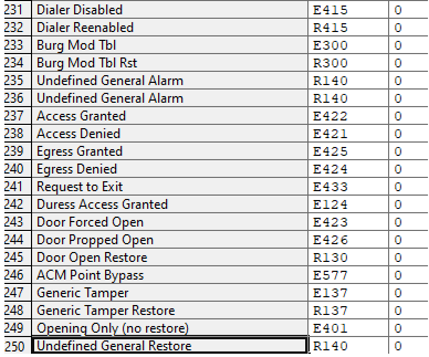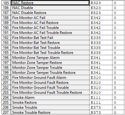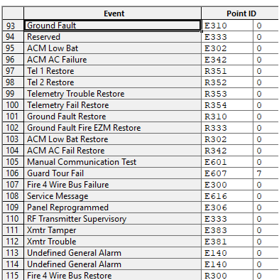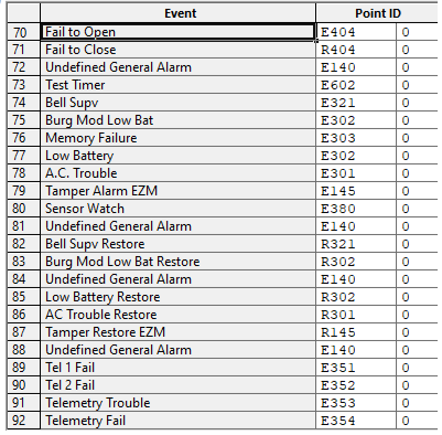 Control Panel DACTS are required to send detailed information regarding the reported condition (a 'generic' trouble is insufficient). For example, E = Alarm, R = Restore. Be aware that there are more events than possible event codes; some events have a point # that will report as a zone. For example, a Z300 Z1 A00 is a 24 Hour Trouble Resound; an E300 Z00 A00 is a Fire Bus Failure.