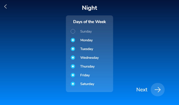 - Select the day(s) of the week for the schedule to run (multiple days can be selected), then select Next: