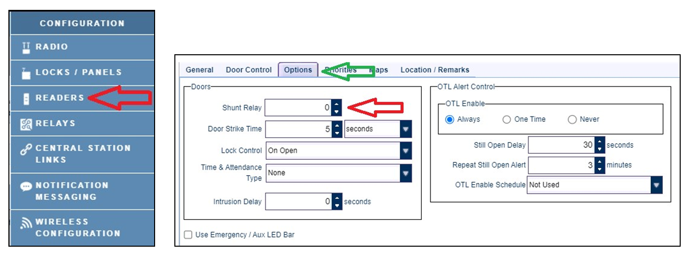 In the Air Access software, select Configuration > Readers. Edit the desired reader, select the Options tab, set the Shunt Relay to "1" and adjust the other options as needed. Select Save and send a full download to that reader.