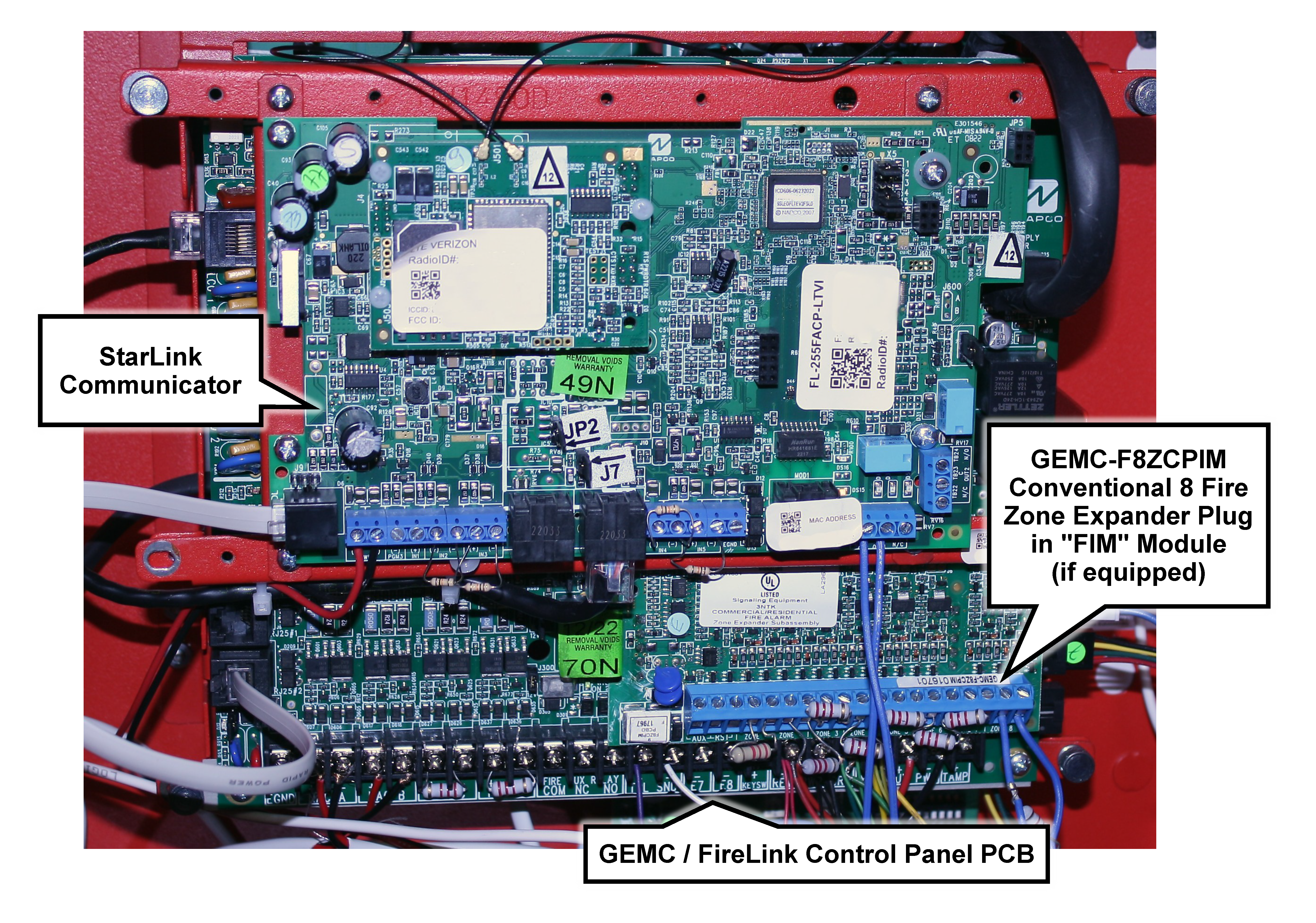 What are the names of the printed circuit boards (PCBs) inside the GEMC / FireLink control panel?