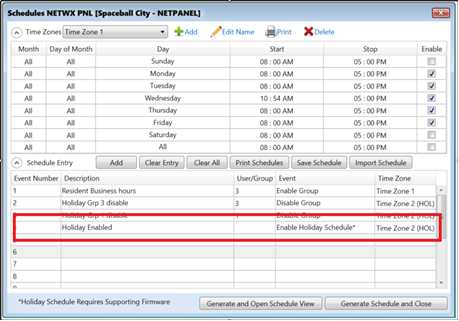 If programming holiday schedules in a DL-Windows 5.5.4 Networx-compliant device, there MUST be an Event configured for "Enable Holiday Schedule" (see image below). Note: Holiday Schedules ONLY disable the Lock/Unlock events; other Events such as Group Enable/Disable are not affected.