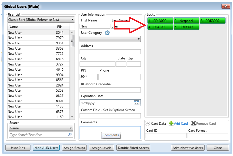 To use DL-Windows to set double-sided access, open the Global Users screen, and ensure the User is enabled for the selected lock by highlighting the User and double-clicking the corresponding rectangular "box" (in the Locks area) to turn it green (see red arrow in image below).