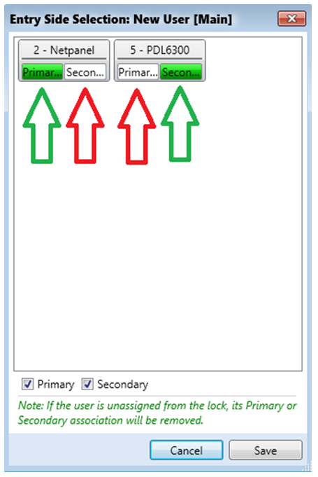 Highlight the User and select the Double Sided Access button at the bottom of the Global Users screen. In the Entry Side Selection screen that opens, select the box corresponding to the side of the door you wish allow or disallow access through the door (green to allow access for the User, white to disallow access).
