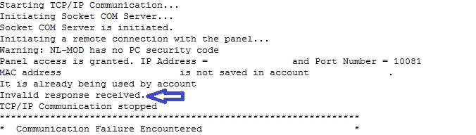 The error "Invalid response received" appears (see image below) when the NL-MOD is reachable but communication does not exist between the NL-MOD and the control panel. This can occur if the local download cable is disconnected or damaged, or if the hardware is faulty. Check the connection by thoroughly inspecting the cables; you can also try disconnecting and reconnecting the cable. In some cases, swapping both ends of the cable can help. If the issue persists, replace the local download cable.