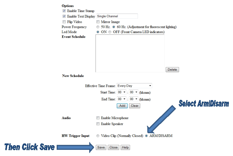 1. In the Single Channel Gateway "Advanced Settings" screen (shown below), for the HW Trigger Input feature, select Arm/Disarm. Click Save to continue.