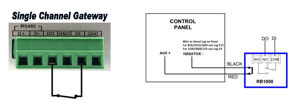 2. Wire a normally closed relay across the "D0" and "Dl" terminals from the RB1000 relay board to the Single Channel Gateway screw terminals (a momentary open across this connection allows triggered video).