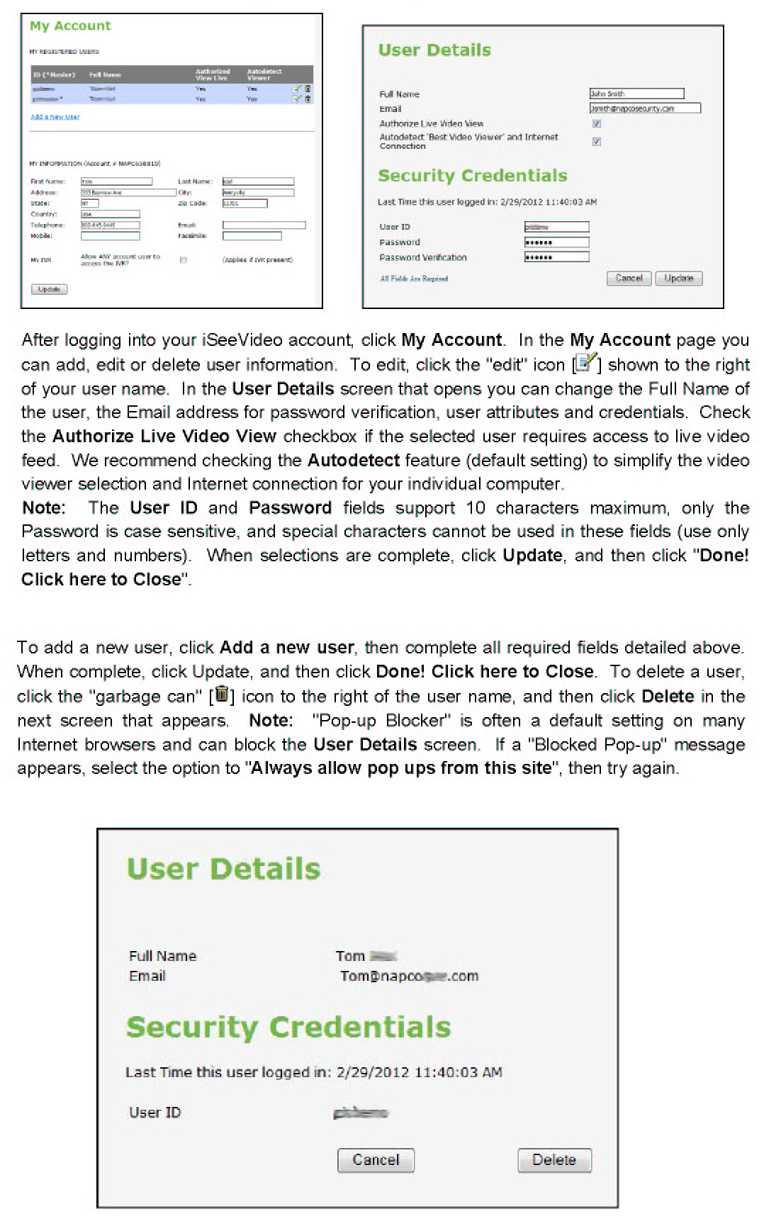 How do I add, edit or delete user codes in an iSeeVideo account?