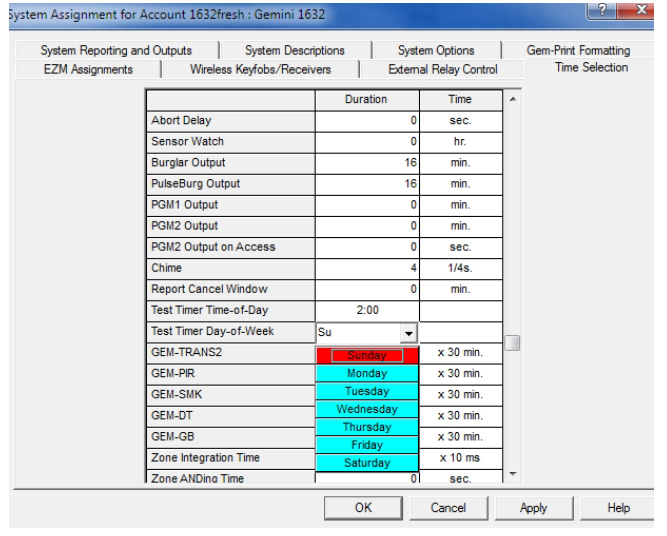 1. In PCD-Windows Quickloader, open the System Assignment screen, Time Selection tab. In the Test Timer Time-of-Day field, type the time (in 24-hour military format) you wish the report to be sent. Select a day in the Test Timer Day-of-Week field for a weekly test report, or click to highlight every day of the week for daily test reports.
