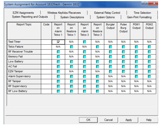 2. Then open the System Reporting and Outputs tab and for the Test Timer report, check the Report on Alarm Telco 1.