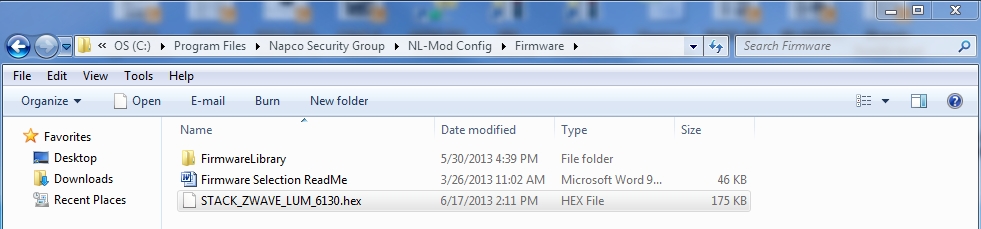 - Place the Z-Wave *.hex file into the default folder C:\Program Files\Napco Security Group\NL-Mod Config\Firmware as shown below.