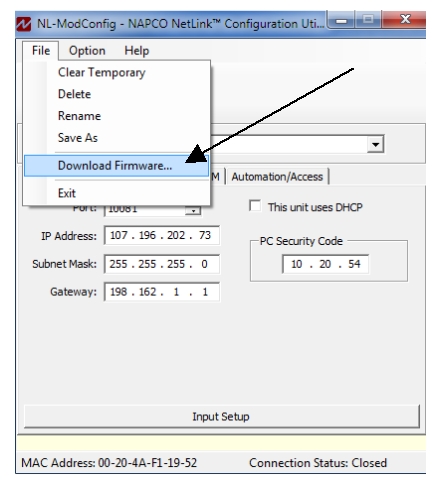 - Using the NL-MODCONFIG software V3.0.2.1, click File > Download Firmware (see next image).