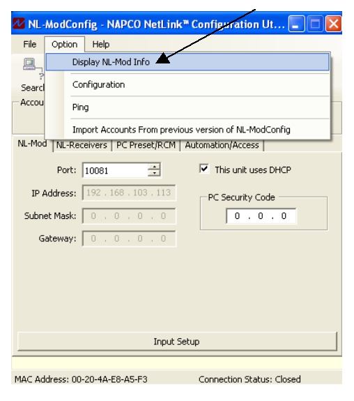 - When finished, verify the latest firmware has been installed by clicking Option > Display NL-MOD Info. Ensure the latest Z-Wave firmware is displayed.