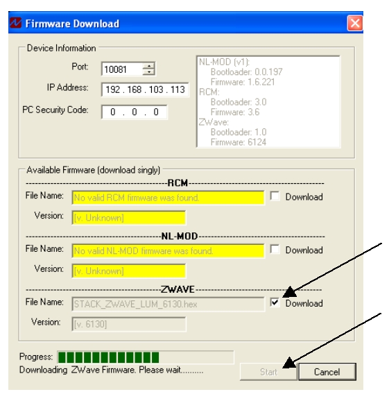 - In the Firmware Download dialog (shown below), look for the latest firmware .hex file under the ZWAVE heading. Check the Download checkbox and click Start. The firmware update process will begin.