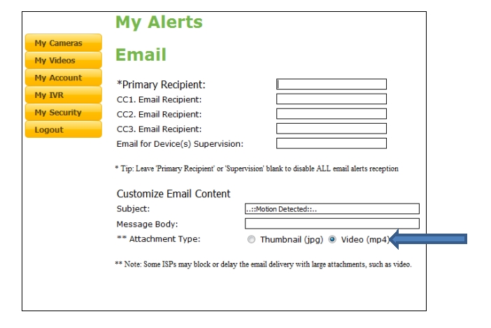 The maximum amount of storage for iSeeVideo video clips is 50MB per camera. A recommendation is to set up a separate email address for your customer (e.g. Gmail or Yahoo) dedicated to iSeeVideo email alerts. At the website (www.videoalert.net), click "My Alerts" and select the "Video" attachment type radio button (shown below), to allow you to view past video clips provided they are not deleted by your customer. The use of a separate email address allows for additional storage space based upon what the email provider allows (for example, Gmail allows up to 5GB of stored email data).
