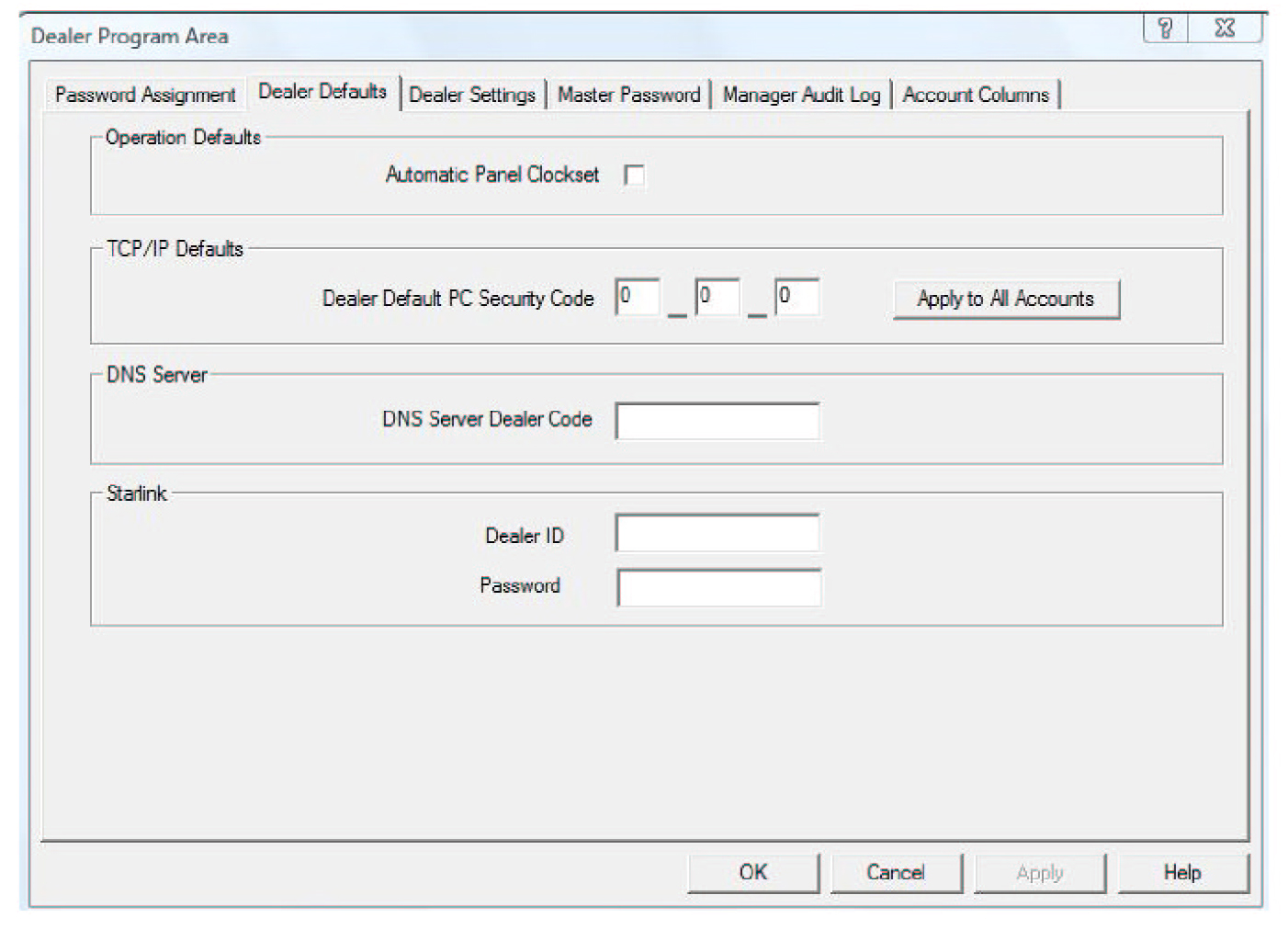 Once this error message appears, close the account in Quickloader, then click File, Dealer Settings, then click the Dealer Defaults tab. Here you need to type the DNS Server Dealer Code (see image below). Note that the Code is limited to 1-8 characters and special characters should not be used. If you have multiple installations of Quickloader and NL-MOD / iRemote-MODs in the field, be sure to use the same DNS Server Dealer Code.